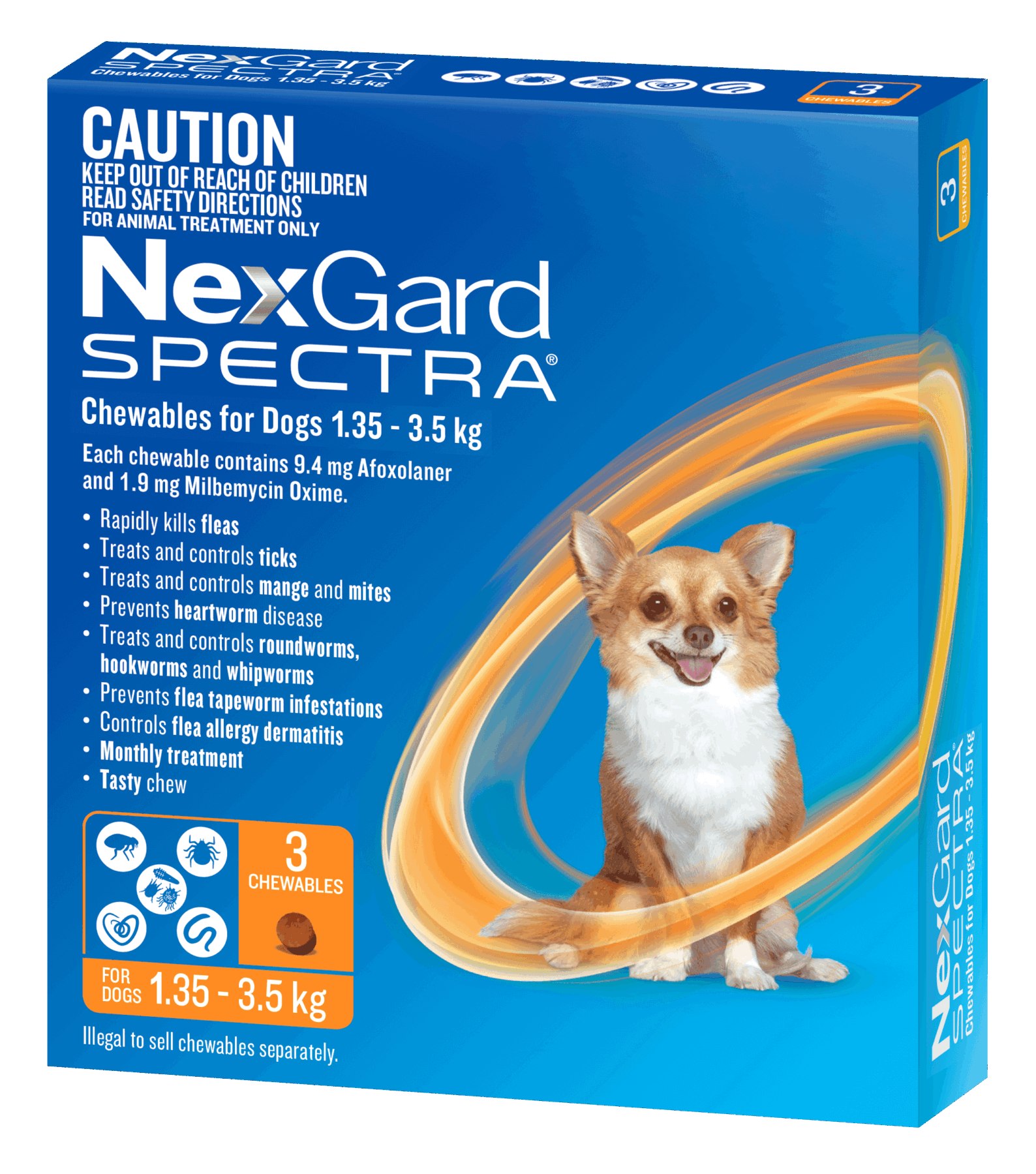NEXGARD SPECTRA Very Small Dog 1.35kg is a monthly chew formulated to provide broad-spectrum parasite protection for dogs. When used as directed, it offers coverage against fleas, ticks, mites, intestinal worms and heartworm, and is easy to give as part of your dog’s regular parasite management routine.