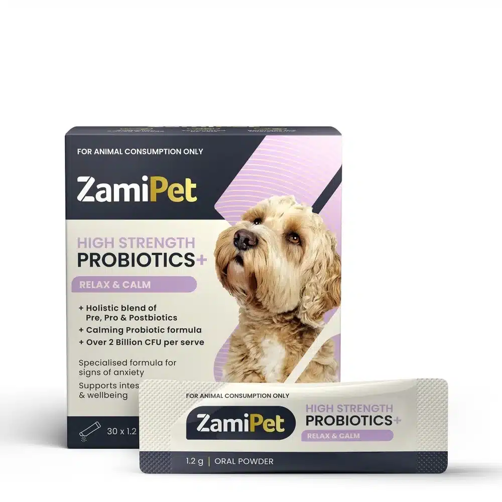 ZamiPet High Strength Probiotics+ Relax & Calm offer a holistic blend of prebiotics, probiotics and postbiotics in convenient 1.2g sachets.